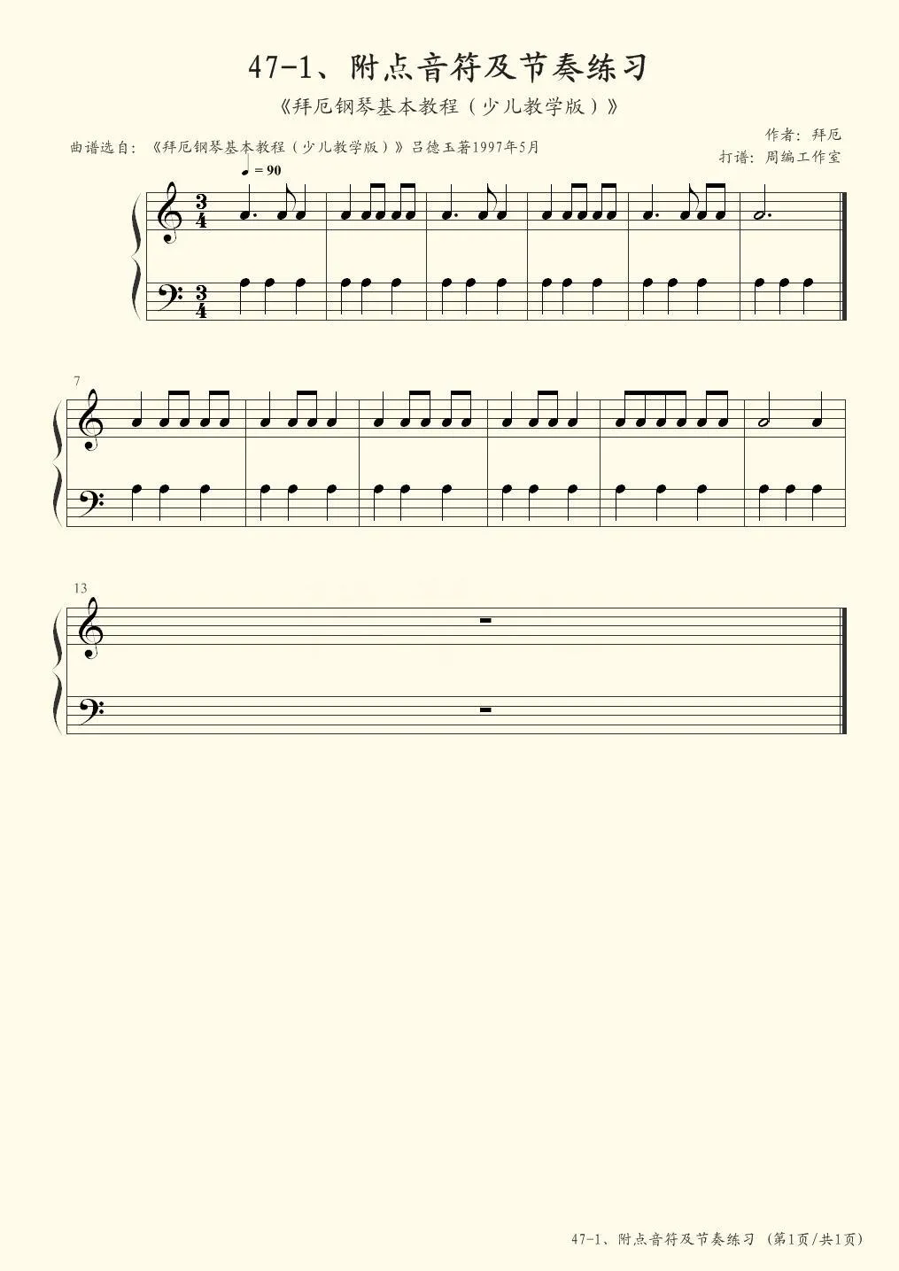 47-1、附点音符及节奏练习(《拜厄钢琴基本教程(少儿教学版)》)[拜厄]-Z0491